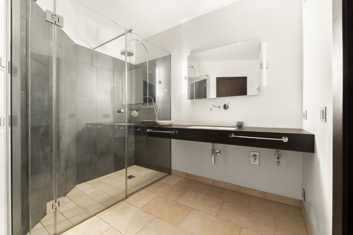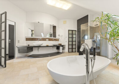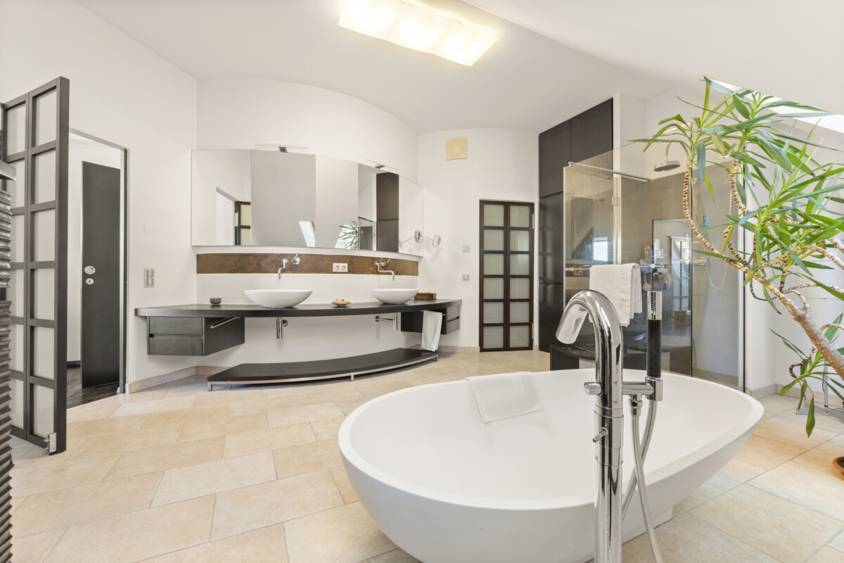 • Luxuriöses Badezimmer mit freistehender Badewanne, Doppelwaschbecken, Dusche und WC