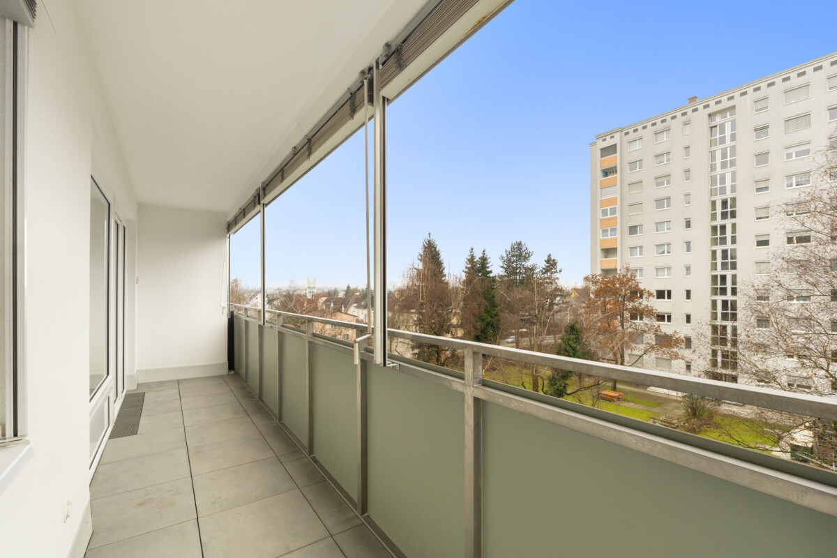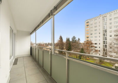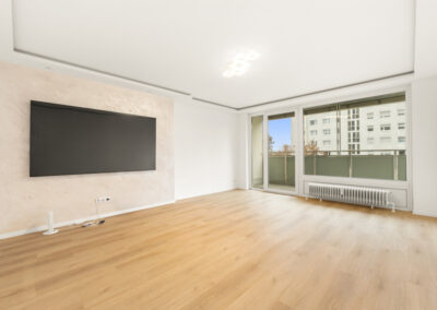 Herzstück der Wohnung ist das große Wohnzimmer mit direktem Zugang zur überdachten Loggia (ca. 10 m²) – ideal zum Entspannen.