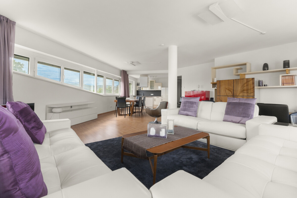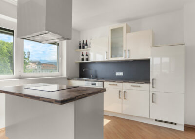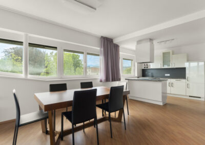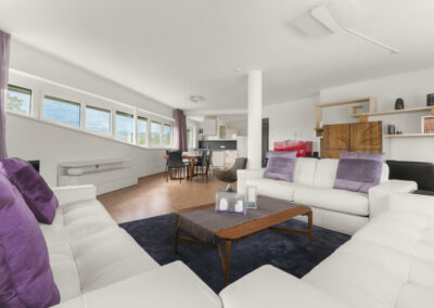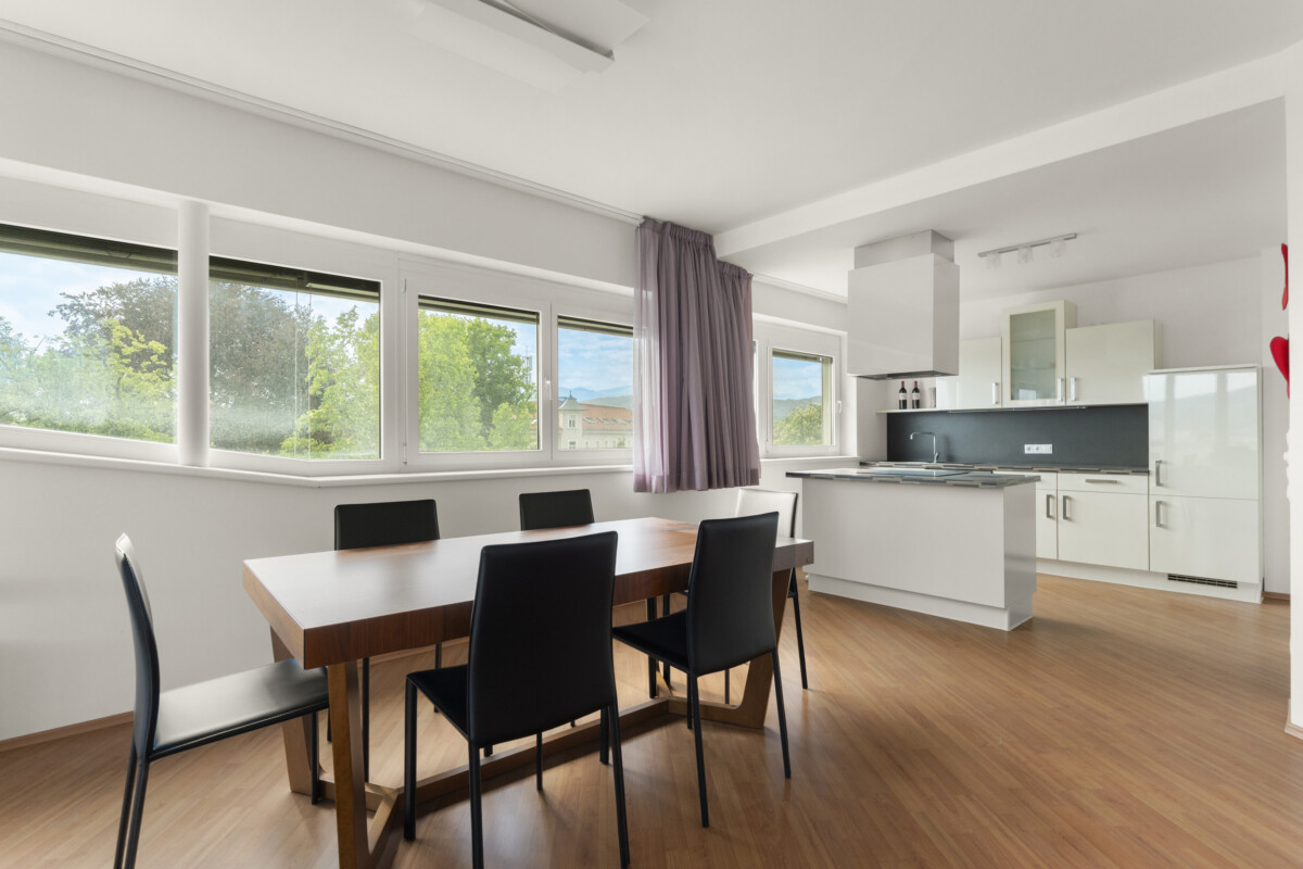 Die offene Küche ist perfekt in den Raum integriert und ebenfalls komplett ausgestattet – ideal für alle, die gerne kochen oder Gäste empfangen. Große Fensterflächen sorgen den ganzen Tag über für eine freundliche, helle Atmosphäre. Elektrisch steuerbare Raffstores sorgen auf Wunsch für perfekten Sonnenschutz und Privatsphäre.