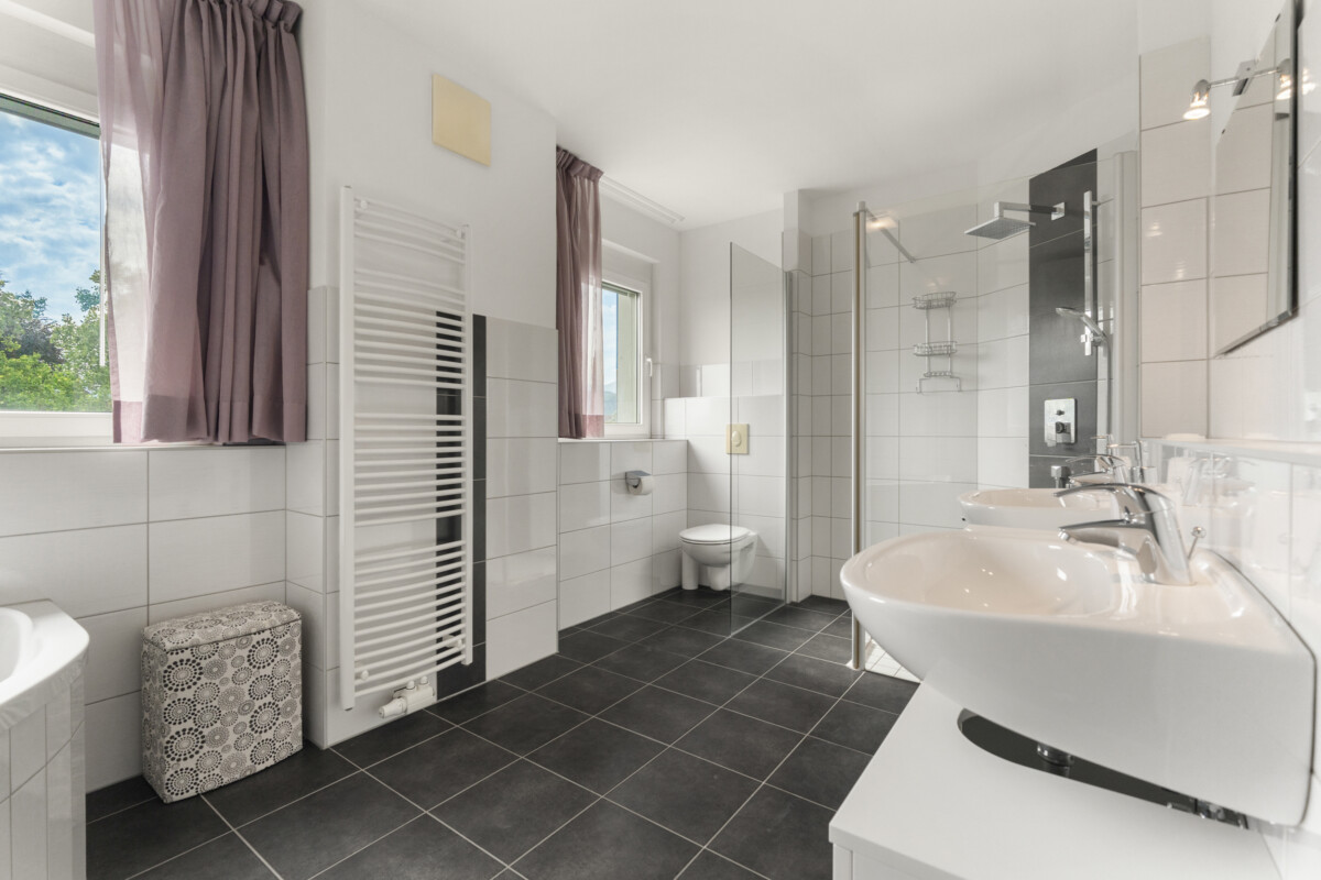• Badezimmer: Doppelwaschbecken, große Eckbadewanne & separate Dusche