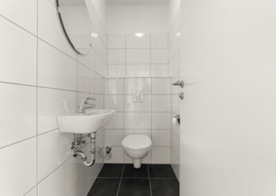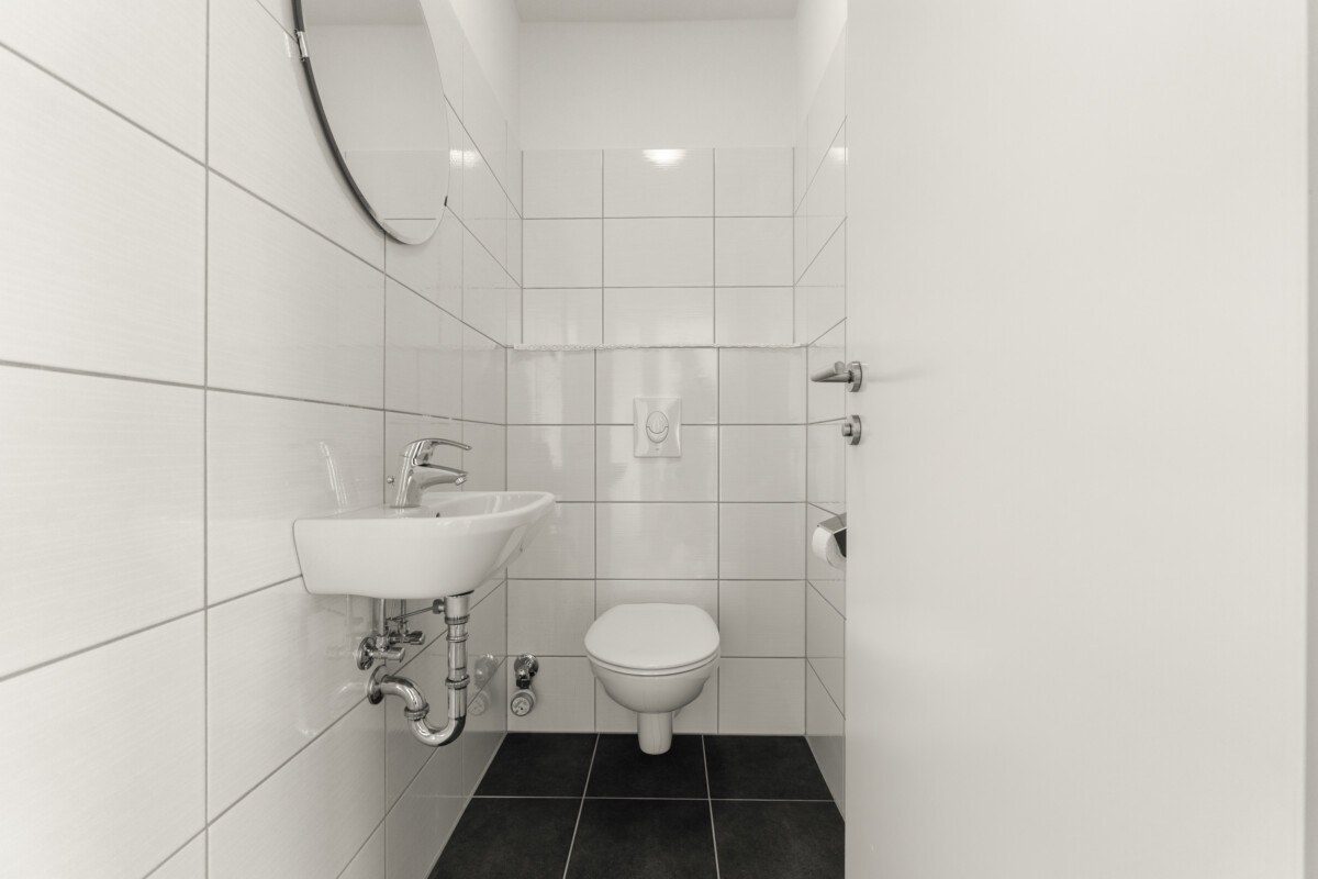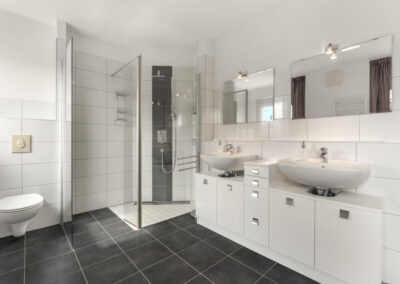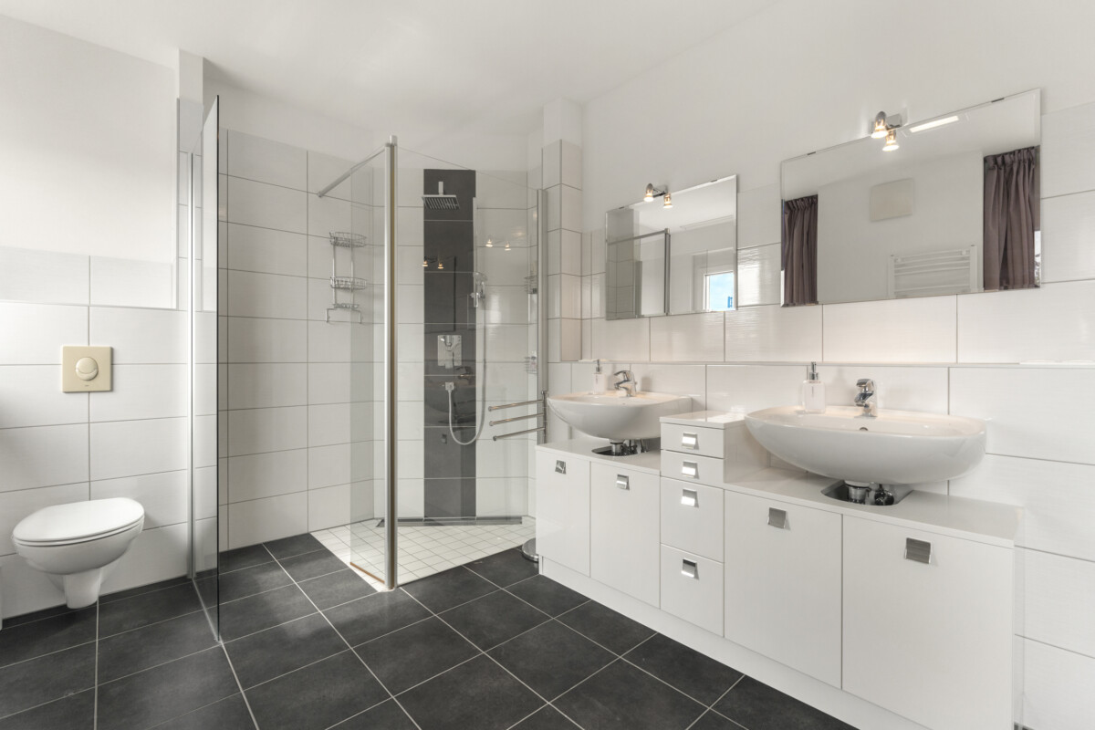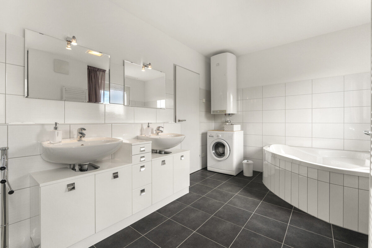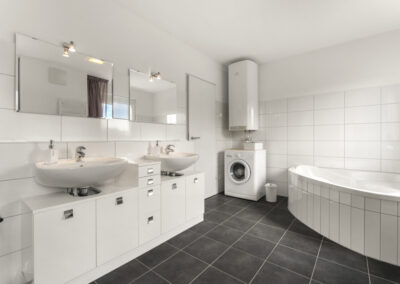 Das Badezimmer überzeugt mit moderner Ausstattung: Doppelwaschbecken, großzügige Eckbadewanne, separate Dusche sowie stilvolle Oberflächen und Armaturen. Ein separates WC sorgt für zusätzlichen Komfort im Alltag.